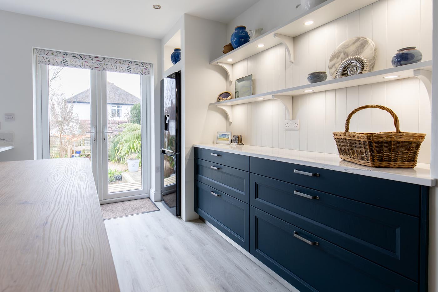 Open shelving adds a warm, personal touch, beautifully styled with ceramics and natural accents that echo the kitchen’s calm, coastal-inspired palette. Soft white tongue-and-groove panelling and brushed metal hardware complete the look, while full-height glass doors invite in natural light and garden views, making this kitchen a true centrepiece of the home.