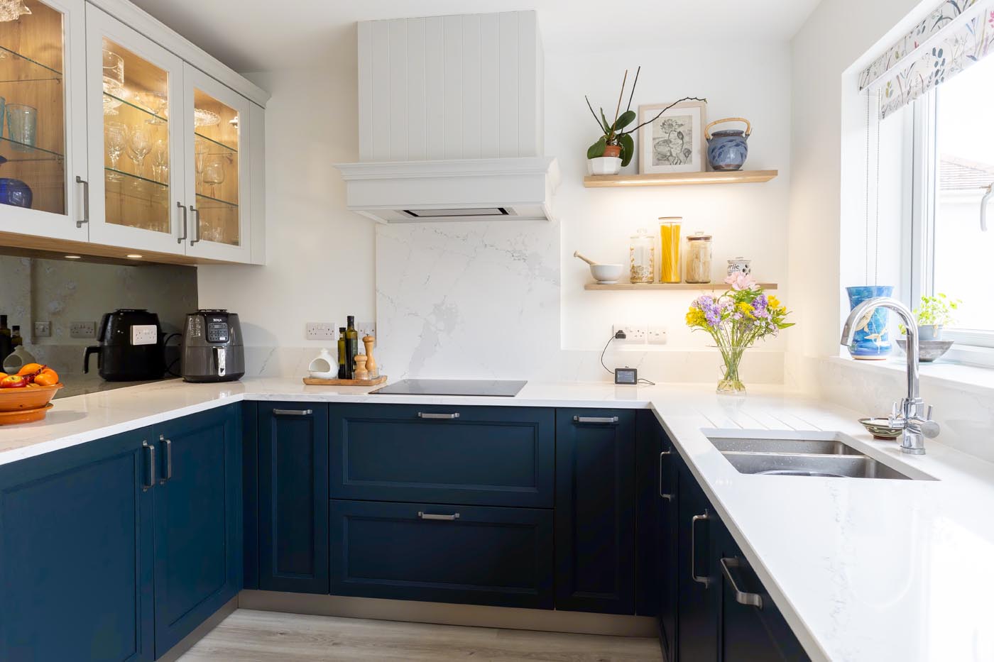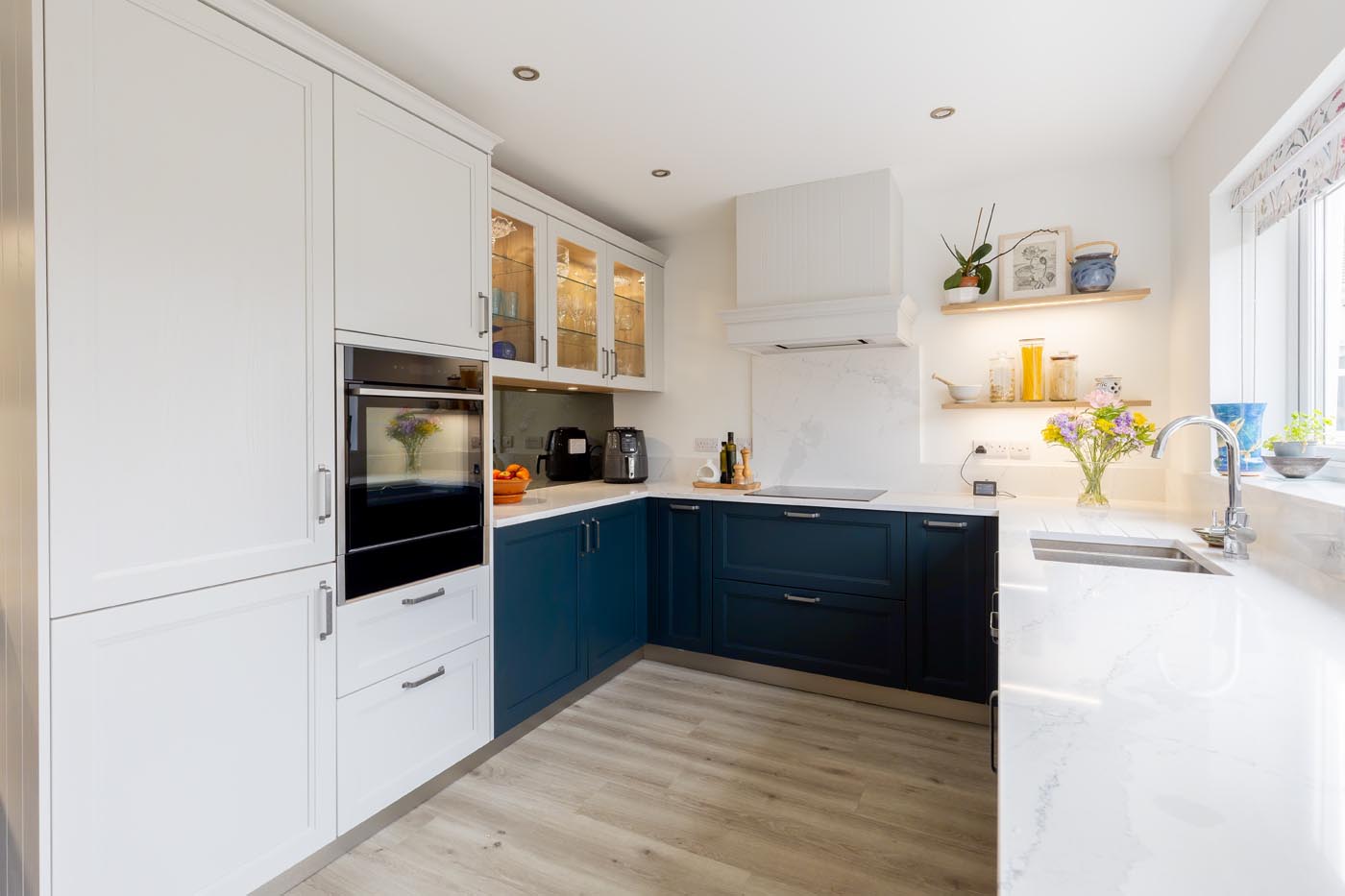 This striking kitchen pairs rich navy blue shaker units with pristine white quartz worktops, creating a bold yet balanced aesthetic that feels both modern and timeless. Thoughtfully laid out for everyday functionality, the space features integrated appliances, under-cabinet lighting, and generous prep areas—all designed with both practicality and elegance in mind.